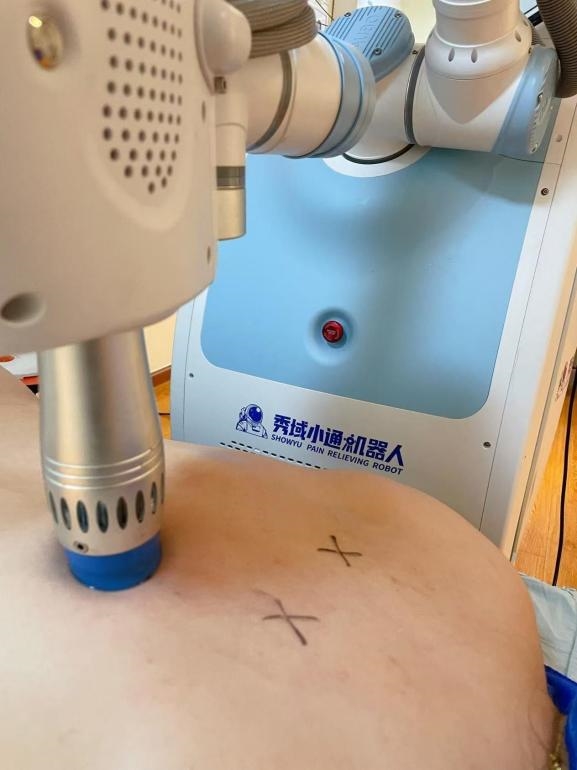 先做的是点阵波小通机器人。我妈趴好后,小通机器人就开始自己操作了,好像用的是什么声波原理。一开始妈妈还说“没啥感觉”,过了不到一分钟,她就“哎哟”一声,说哪儿哪儿酸胀得厉害!顾问说这就是找到地方了,酸胀就对了,说明声波能量透到粘连的筋膜层了,正在给松开呢。我妈后来跟我说,那感觉就像有一股沉稳有力的劲儿,直接钻到腰里面那个“锈住”的地方,一点点地把它冲开、冲散。虽然过程有点酸胀,但能明显感觉到里面在松动。