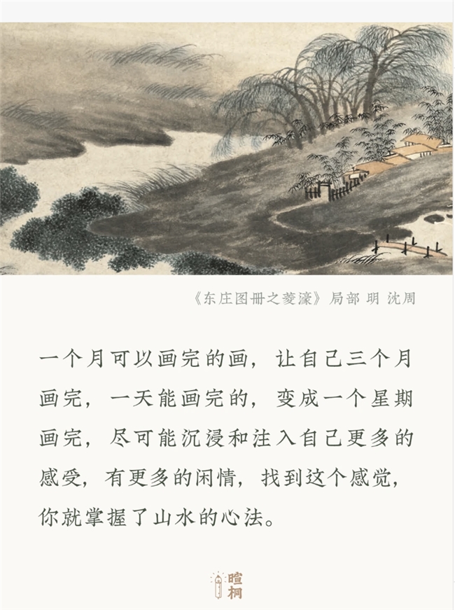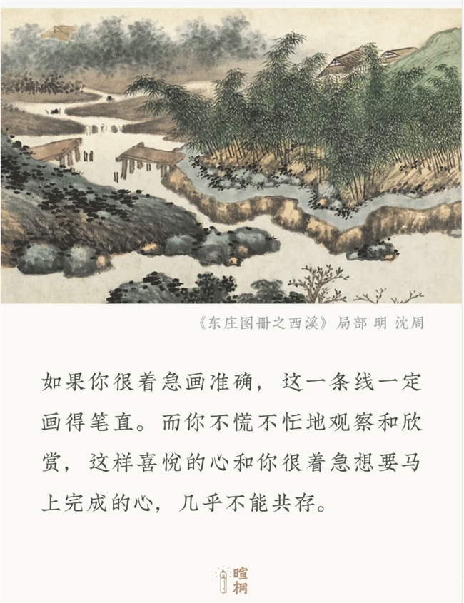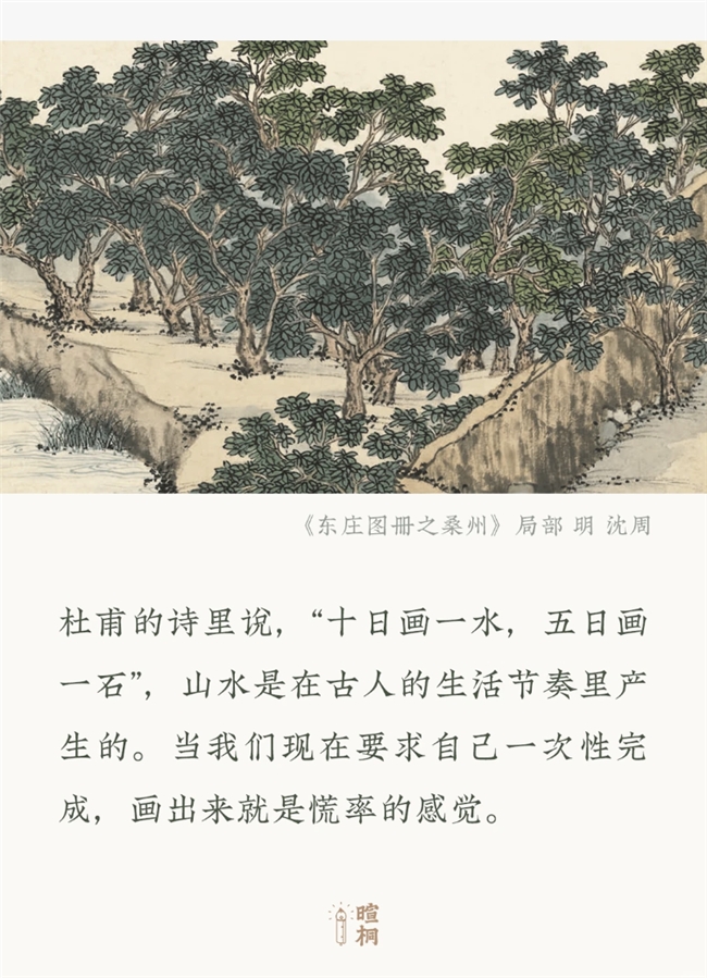 桐学们正在临摹的明代沈周《东庄图册》,更是有种朴拙天真的美。沈周的一生,正是在这样平静、淡然的生活节奏中度过的,去体会沈周的心境,也才能画出画的精神。在林曦老师看来,山水画的原点,正是我们的内心。